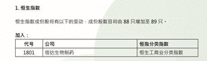 信达生物(01801)将被纳入恒生指数成份股,成份股数目将由 88 只增加至 89 只。