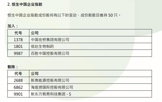 中国宏桥(01378)、信达生物、百胜中国(09987)将被纳入恒生中国企业指数成份股,新奥能源(02688)、新东方-S(09901)等将被剔除。成份股数目维持50只。