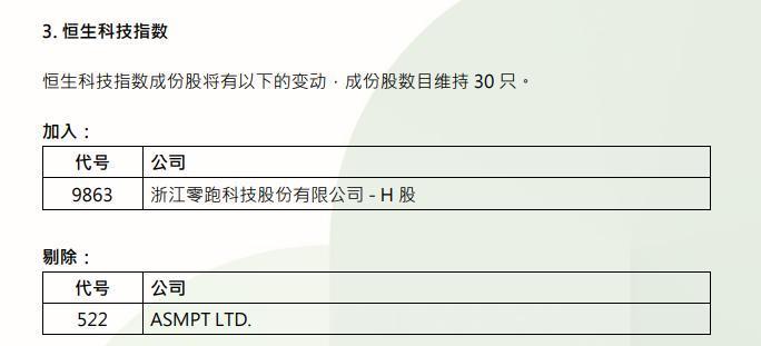 零跑汽车(09863)将被纳入恒生科技指数成份股,ASMPT(00522)将被剔除,成份股数目维持30只。