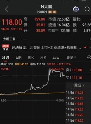在A股三大指数回调之际,有资金开始转战新股,今日上市的新股大鹏工业遭到爆炒,午后一度暴涨超1666%,最高触及159元/股,截至收盘,大鹏工业报118元/股,大涨1211.11%,换手率达到98.28%,总市值超过72亿元,总市值一天暴增70亿元。