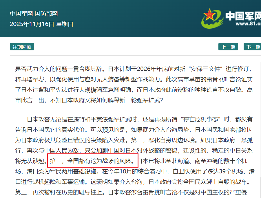 近日,日本电视台的一个节目中,展示了一项民调显示日本83%的人支持日本武力介入台海。事实上,日本早已着手将全国范围内的民用设施转为潜在军用节点。这种强大的民意基础才是高市早苗对华言论的基础。但值得注意的是,就在该民调曝光后不久——2025年11月16日,《解放军报》在第4版要闻区刊发署名评论文章,明确指出:“一旦日本选择军事介入台海,其本土将不可避免地成为战场。”这可谓是最直接的警告了。据日本防卫省公开资料,截至2025年,日本已在全国范围内完成对数十个机场和港口的“军民两用化”改造。这些设施北起北海道的新千岁机场、南至冲绳的那霸港,覆盖本州、四国、九州及琉球群岛多个战略要地。仅在2025年10月举行的年度“统合防卫演习”中,日本自卫队就动用了39个机场和港口进行实战化演练,包括F-15J战斗机在民用跑道起降、C-2运输机在地方港口实施快速投送等科目。这种全国性、高强度的战备部署,意味着一旦爆发冲突,日本若选择派兵或提供后勤支援,其境内几乎所有具备战略价值的交通节点都可能成为打击目标。《解放军报》的警告,正是基于此类现实推演:现代战争早已超越传统前线与后方的界限,任何直接参与冲突的国家,其本土都将暴露于火力覆盖之下。东风系列和长剑系列导弹早已锁定相关目标,只等一声令下装订射击诸原,就可以让日本这83%的民众感受到原来事情和他们想的不一样。